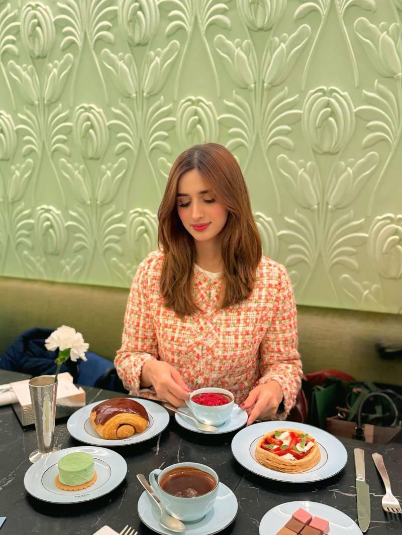 In her Instagram story, Alishba highlighted a beautifully arranged table featuring the cafe’s signature offerings, including rich hot chocolate topped with fresh raspberries, delicate pastries, and a selection of branded chocolates. The treats were served on Prada’s signature pale blue porcelain, known for its minimalist design and luxury appeal.