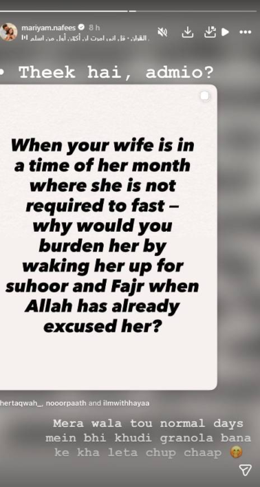 In another Instagram story, Mariyam showcased her humor while commenting on cultural expectations during Ramadan. She reposted a lifestyle religious quote about husbands waking wives for Suhoor and Fajr prayers even while they are menstruating, when women are excused from fasting and prayer.