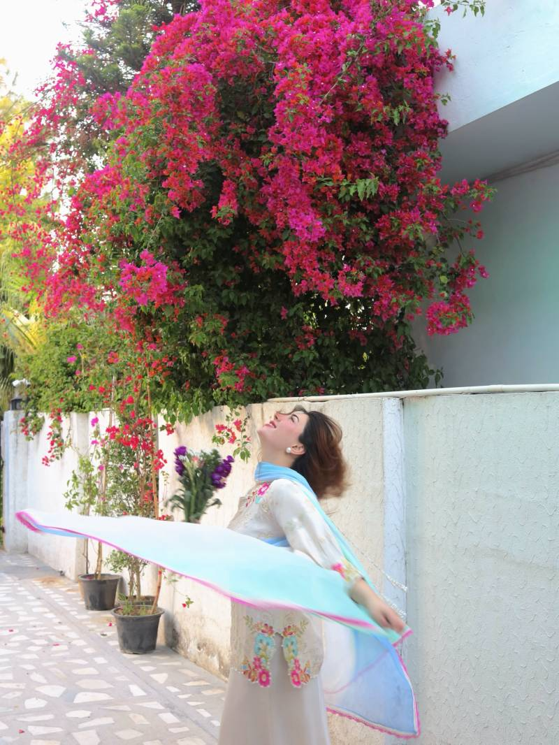 The setting enhances the aesthetic appeal. Warm, golden-hour sunlight highlights earthy textures and minimal décor, reflecting Naimal’s signature calm and refined style. Outdoor shots bring a lively contrast, showcasing blooming bougainvillea cascading over white walls, with Naimal in a cream kurti and turquoise dupatta. Close-up images of irises, sunflowers, and gladioli add further vibrancy, connecting the visuals to nature.