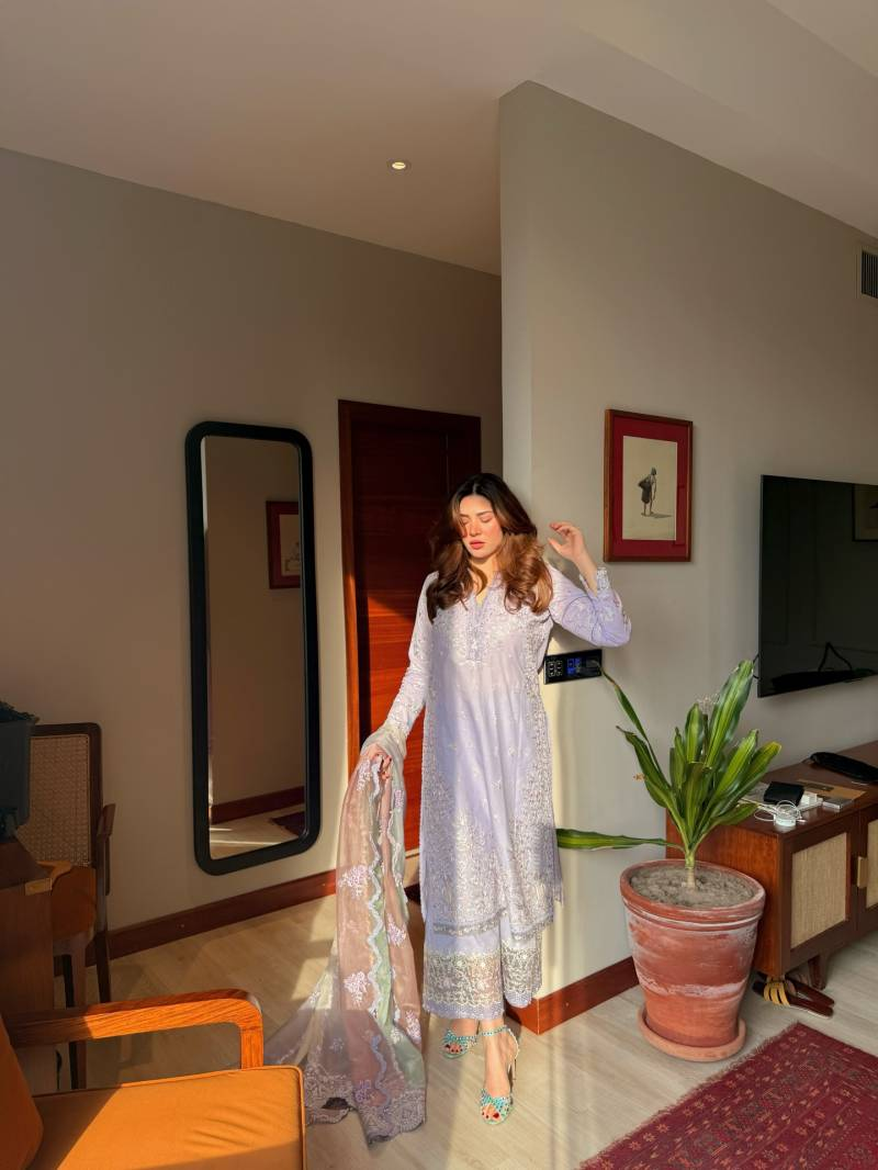 At the heart of her indoor shots is a lavender formal ensemble. The embroidered kameez, detailed with silver threadwork and sequins, exudes understated elegance, complemented by a multi-tonal organza dupatta in soft shades of sage, pink, and lilac. Accessories such as an ombre rhinestone clutch and aqua-toned heels add a modern twist to the classic look.