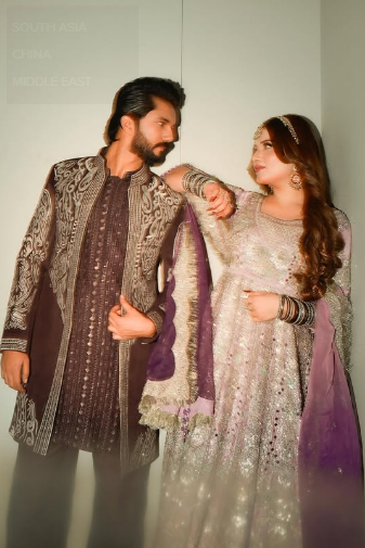 Hussain makes an equally striking entrance in a raisin-purple sherwani embroidered with intricate silver detailing. His ensemble, paired with tailored trousers and polished footwear, complements Rabeeca’s attire with perfect coordination. With poised confidence, he steps forward to join her as the music builds.