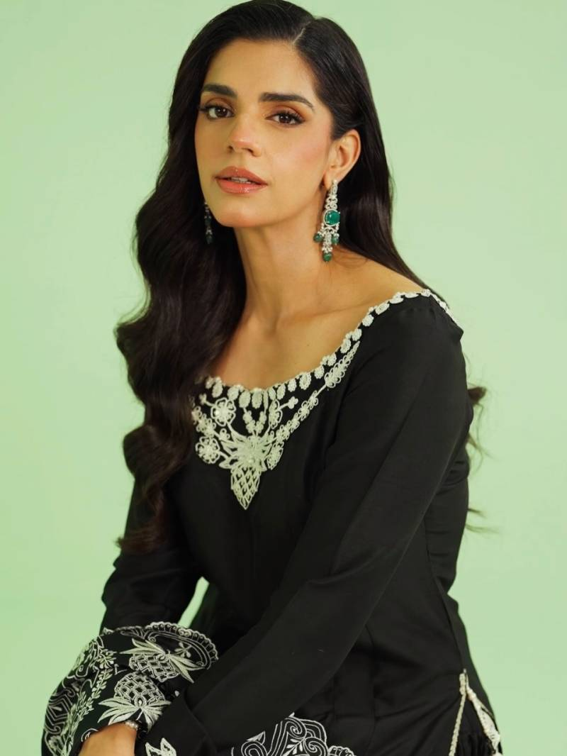 In her recent shoot, Sanam Saeed embraces a classic black and white ensemble that blends traditional craftsmanship with a modern editorial aesthetic. The look is structured yet graceful, reflecting a carefully balanced sense of style that has become synonymous with her public image.