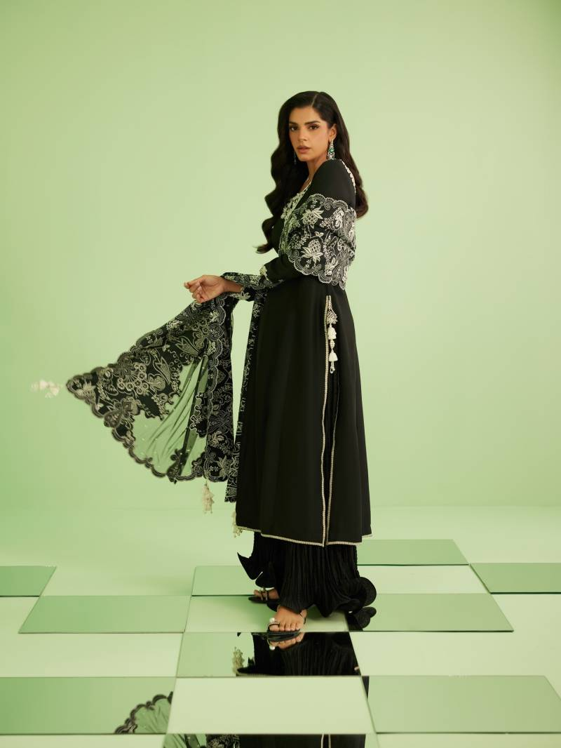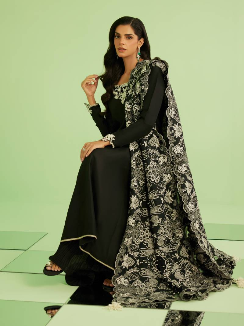 The black kameez features intricate white embroidery along a wide neckline, highlighting detailed artistry while maintaining a clean and sophisticated finish. The fitted sleeves carry subtle threadwork that adds depth without overwhelming the design, reinforcing the outfit’s understated elegance.