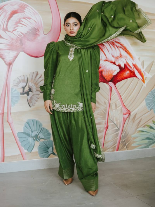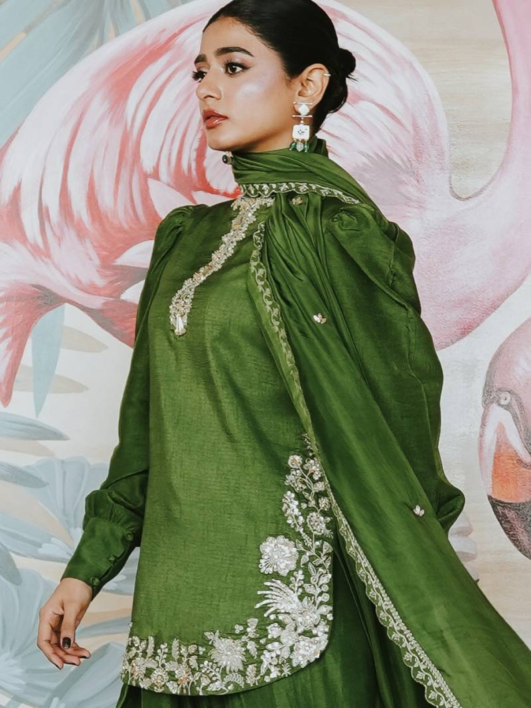 Sehar wore a rich moss green three-piece outfit that reimagined classic Eastern wear with a high-fashion touch. The short kameez featured a round neckline adorned with delicate silver threadwork, while intricate floral embroidery on the hemline and side slits added texture and elegance. Structured puff sleeves with elongated buttoned cuffs provided a dramatic yet polished detail.