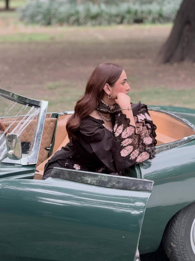 The post features a series of visually rich frames that highlight different moods and styling directions. In one of the most eye-catching images, Yumna Zaidi is seen seated in a classic green convertible car, wearing a black outfit enhanced with delicate floral embroidery and lace detailing. The look is completed with soft vintage waves and traditional jewelry, creating a refined blend of old-world charm and modern elegance.
